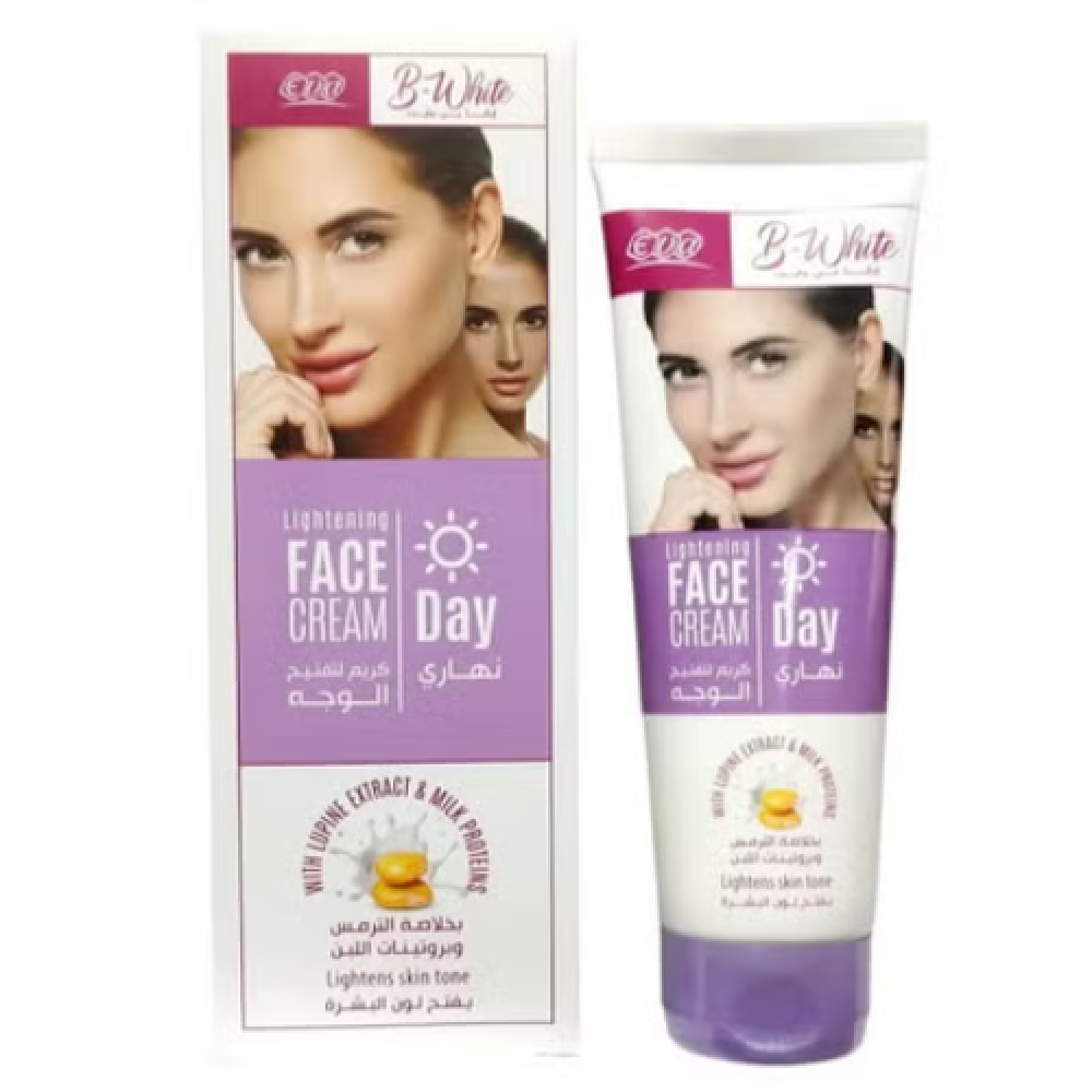 - ايفا بي وايت كريم التبيض النهاري العادي والذي يحتوي على خلاصة الترمس و بروتينات الحليب الطبيعي ليجعل البشرة اكثر صحة ونضارة