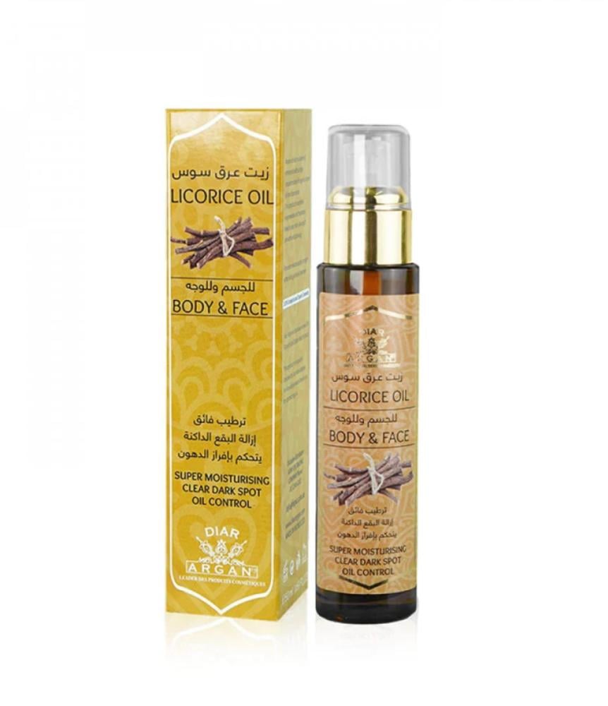زيت عرق السوس للجسم والوجه ترطيب فائق وإزالة البقع الداكنة يتحكم بإفراز الدهون ديار ارجان 50مل :